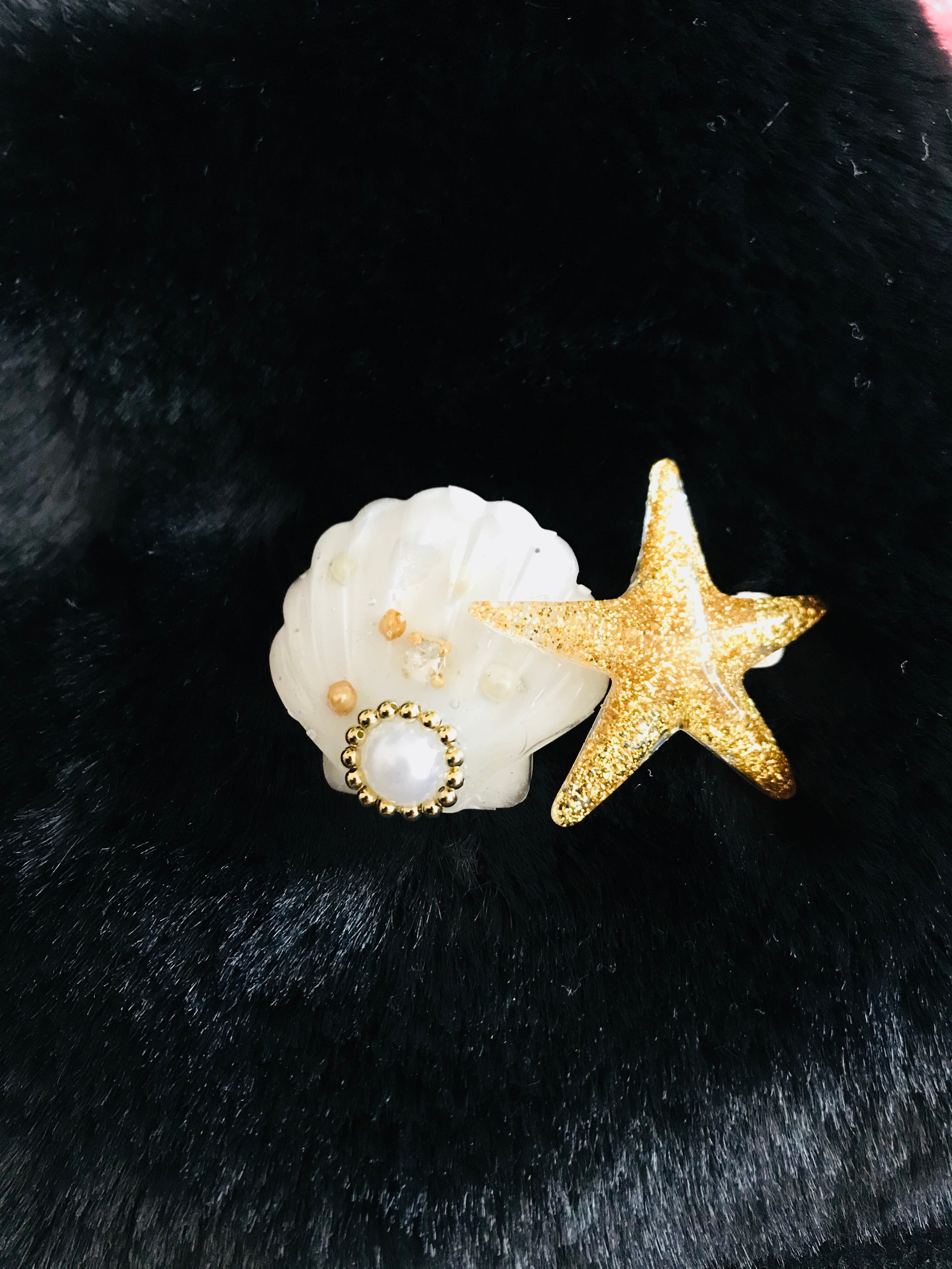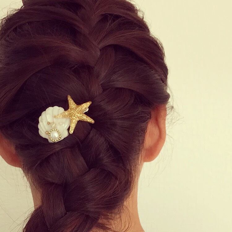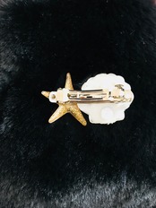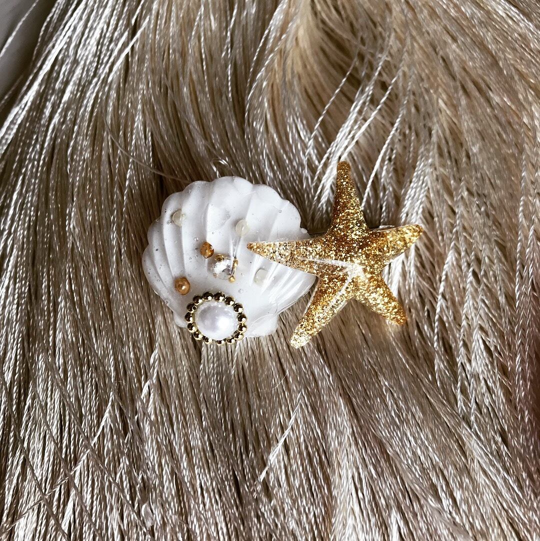 グリッタースターフィッシュとパール、スワロフスキーを閉じ込めた上品なシェルをバレッタにしました。